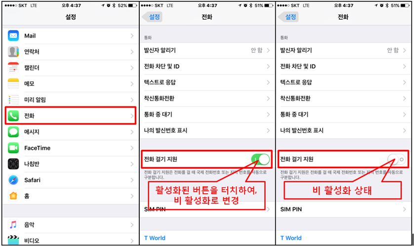 [설정->전화->전화걸기지원 비 활성화]