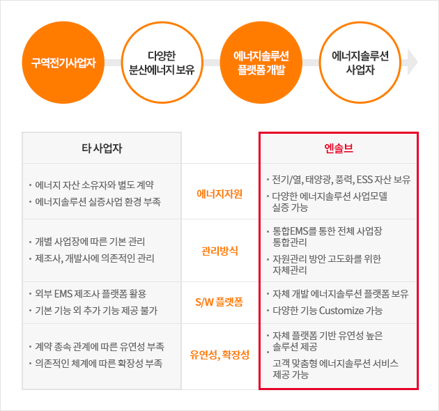 엔솔브는 구역전기사업과 더불어 다양한 분산자원을 자체 보유하고 있으며, S/W 플랫폼을 활용한 다양한 사업모델을 개발하고 실증할 수 있는 국내 유일한 에너지솔루션 사업자입니다.